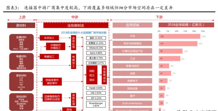 連接器產(chǎn)業(yè)鏈涵蓋了從上游金屬材料、塑料材料、電鍍材料到下游汽車、通信、消費(fèi)電子、國(guó)防軍工等多個(gè)領(lǐng)域。行業(yè)上游主要是黑色金屬、有色金屬、稀有貴金屬、工程塑料等原材料加工行業(yè)。上游原材料的價(jià)格和運(yùn)輸成本是連接器成本控制的關(guān)鍵。但由于上游多為大宗商品,價(jià)格波動(dòng)較低,且供應(yīng)商較多,連接器企業(yè)一般不會(huì)基于規(guī)模經(jīng)濟(jì)向上游擴(kuò)展供應(yīng)鏈系統(tǒng)。連接器作為傳輸信號(hào)和交換信息的基本單位,決定了電子信息領(lǐng)域涉及的所有終端產(chǎn)品都需要使用,因?yàn)檫B接器的下游幾乎覆蓋了電子行業(yè)的整個(gè)領(lǐng)域。然而,由于終端需求和單個(gè)產(chǎn)品信息程度的不同,分段連接器的市場(chǎng)規(guī)模在不同領(lǐng)域有很大差異。例如,畢曉普協(xié)會(huì)(Bishop Associates)的數(shù)據(jù)顯示,2018年,全球汽車連接器市場(chǎng)規(guī)模達(dá)到158億美元,而國(guó)防和航空領(lǐng)域的連接器規(guī)模僅為39億美元,僅占汽車領(lǐng)域規(guī)模的25%左右。