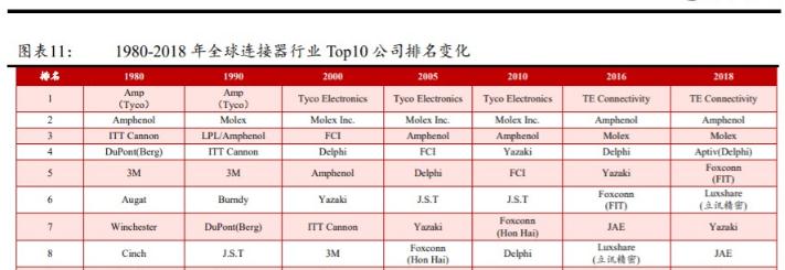 并購(gòu)浪潮和亞洲廠商的崛起沖擊了原有的競(jìng)爭(zhēng)格局,但全球整體競(jìng)爭(zhēng)格局相對(duì)穩(wěn)定,北美行業(yè)集中度有所提高。從1985年到2018年10月1日,Bishop Associates記錄到連接器行業(yè)完成并購(gòu)589起,2000年以后共完成并購(gòu)463起。在并購(gòu)浪潮中,三大連接器巨頭安費(fèi)諾、泰科、莫萊克斯一直在積極收購(gòu)部分競(jìng)爭(zhēng)對(duì)手。安費(fèi)諾從1999年到2018年收購(gòu)了52家公司。同期,泰科電子收購(gòu)了25家公司,Molex收購(gòu)了27家公司。大規(guī)模的M&A在一定程度上推動(dòng)了行業(yè)集中度的提高,前三名公司的市場(chǎng)份額從1999年的29.4%上升到2017年的64.7%。值得注意的是,1980年排名前10的公司中沒(méi)有亞洲公司,但2016年排名前10的有6家亞洲公司,包括李勛京密、富士康(鴻海)、雅崎、JAE、J.S.T和廣瀨,這也與亞洲電子制造能力的提高和亞洲連接器市場(chǎng)需求的擴(kuò)大密切相關(guān)。此外,一些早期的大公司被M&A活動(dòng)中的較大實(shí)體所吸收,例如杜邦公司被弗拉馬通公司(FCI)收購(gòu),然后又被安費(fèi)諾公司收購(gòu)。雖然全球連接器行業(yè)前十大廠商的地位發(fā)生了很大變化,但行業(yè)整體競(jìng)爭(zhēng)格局相對(duì)穩(wěn)定。比如1980年以來(lái),TE Connectivity一直是最大的連接器公司,從AMP更名為泰科國(guó)際,再更名為泰科電子,再更名為現(xiàn)在的TE Connectivity。Molex和Amphenol都在前十。1980年,未能在2018年保持前十名的前十家公司包括ITT坎農(nóng)(坎農(nóng))、伯格3M、溫徹斯特(Winchester)、奧格特(Ogut)、辛奇連接解決方案(Cinch Connectivity Solutions)和伯恩迪(Burndy),其中大部分被總部公司收購(gòu)。
